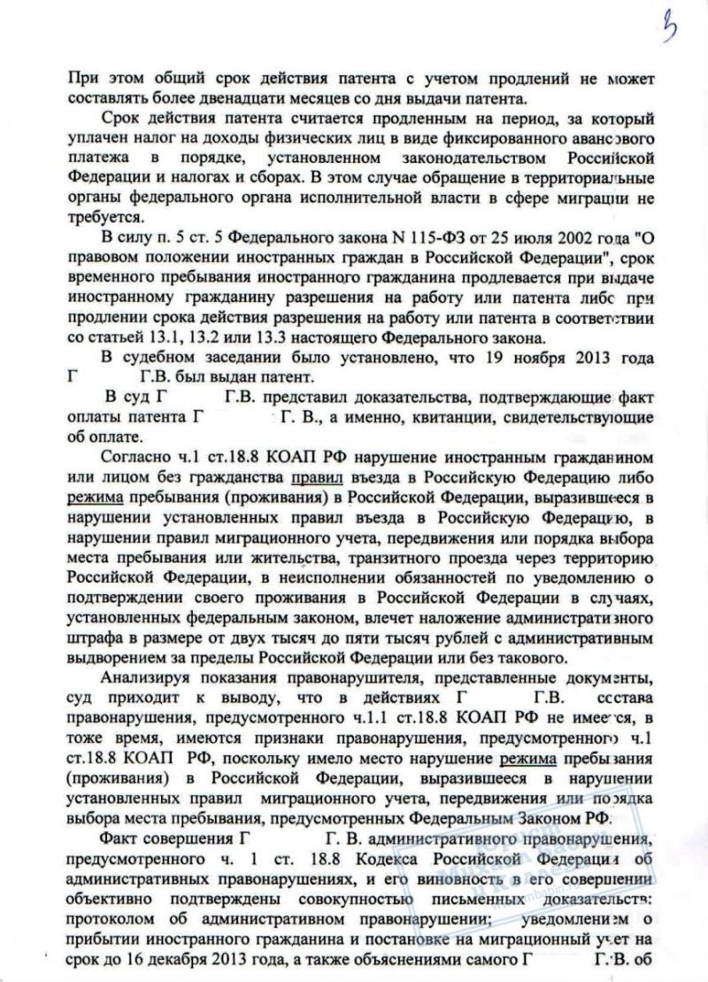 Однако наш юрист, защищающий интересы Г., убедительно представил на суде ряд смягчающих обстоятельств: признание вины, совершение правонарушения впервые, а также своевременную оплату гражданином патента. В результате судья назначила Г. минимально возможное наказание в виде 2000 руб. штрафа без административного выдворения.